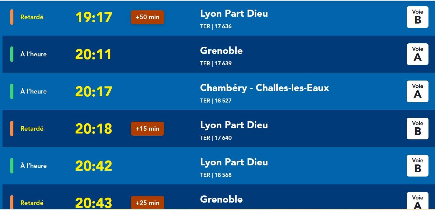 Affichage en gare de Bourgoin – Jallieu à 19h52 :